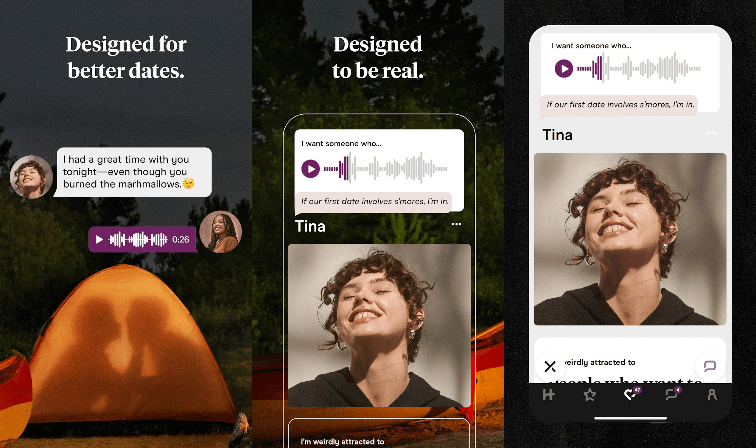 Η εφαρμογή χρησιμοποιεί έναν μοναδικό αλγόριθμο ο οποίος σε “ταιριάζει” με άλλους ανθρώπους που αντιστοιχούν με τις προτιμήσεις, την προσωπικότητα και τον τρόπο ζωής σου. Μπορείς να αλληλεπιδράς με άλλους χρήστες κάνοντας like ή σχολιάζοντας σε συγκεκριμένα μέρη στα προφίλ τους, όπως στις φωτογραφίες, και στέλνοντας μηνύματα και ηχογραφήσεις.