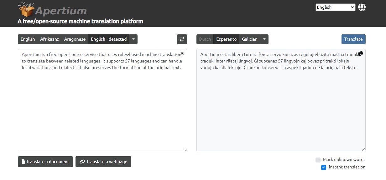 Το Apertium είναι μια δωρεάν υπηρεσία ανοιχτού κώδικα που χρησιμοποιεί μηχανική μετάφραση βασισμένη σε κανόνες για τη μετάφραση μεταξύ σχετικών γλωσσών. Υποστηρίζει 57 γλώσσες και μπορεί να χειριστεί τοπικές παραλλαγές και διαλέκτους. Διατηρεί επίσης τη μορφοποίηση του αρχικού κειμένου, αλλά δυστυχώς δεν υποστηρίζει τα ελληνικά.