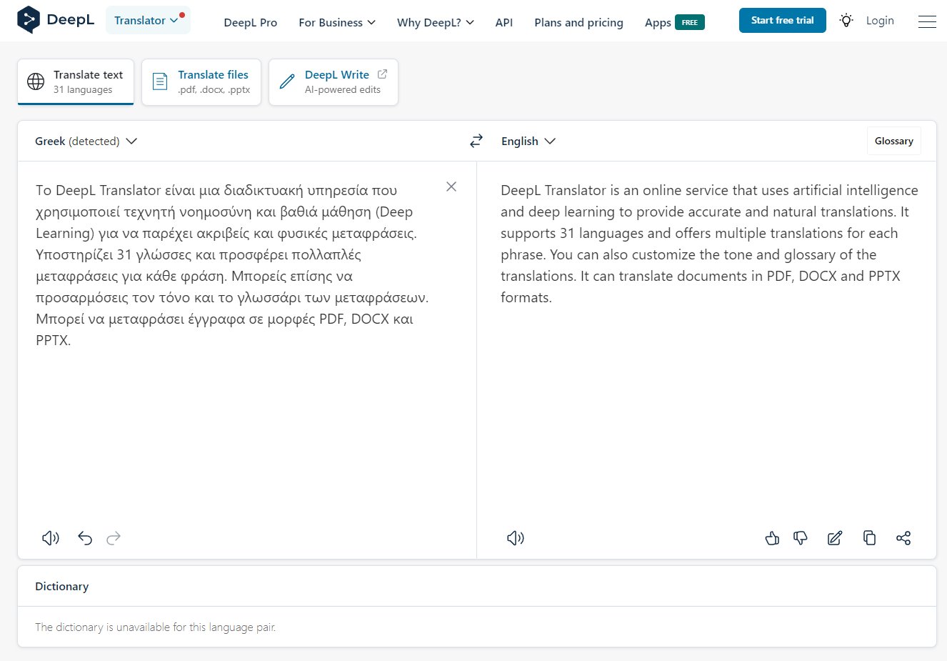 Το DeepL Translator είναι μια διαδικτυακή υπηρεσία που χρησιμοποιεί τεχνητή νοημοσύνη και βαθιά μάθηση (Deep Learning) για να παρέχει ακριβείς και φυσικές μεταφράσεις. Υποστηρίζει 31 γλώσσες και προσφέρει πολλαπλές μεταφράσεις για κάθε φράση. Μπορείς επίσης να προσαρμόσεις τον τόνο και το γλωσσάρι των μεταφράσεων. Μπορεί να μεταφράσει έγγραφα σε μορφές PDF, DOCX και PPTX.