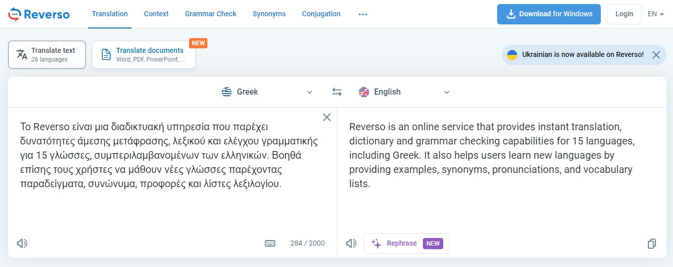 Το Reverso είναι μια διαδικτυακή υπηρεσία που παρέχει δυνατότητες άμεσης μετάφρασης, λεξικού και ελέγχου γραμματικής για 15 γλώσσες, συμπεριλαμβανομένων των ελληνικών. Βοηθά επίσης τους χρήστες να μάθουν νέες γλώσσες παρέχοντας παραδείγματα, συνώνυμα, προφορές και λίστες λεξιλογίου.