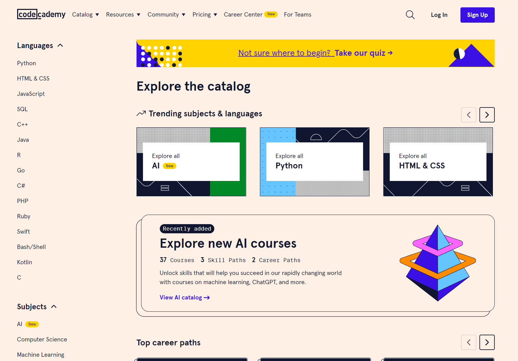 Το Codecademy είναι άλλη μια πλατφόρμα με διαδικτυακά μαθήματα, αλλά ολίγο διαφορετική απ’ τις αντίστοιχες της λίστας. Το Codecademy εστιάζει κυρίως στην ανάπτυξη των δεξιοτήτων σου πάνω στον κώδικα, με γλώσσες προγραμματισμού όπως οι HTML, CSS JavaScript, SQL, Python και πολλές ακόμα. Επιπλέον, θα βρεις μια συλλογή από δωρεάν ψηφιακές σειρές μαθημάτων που μπορείς να παρακολουθήσεις.