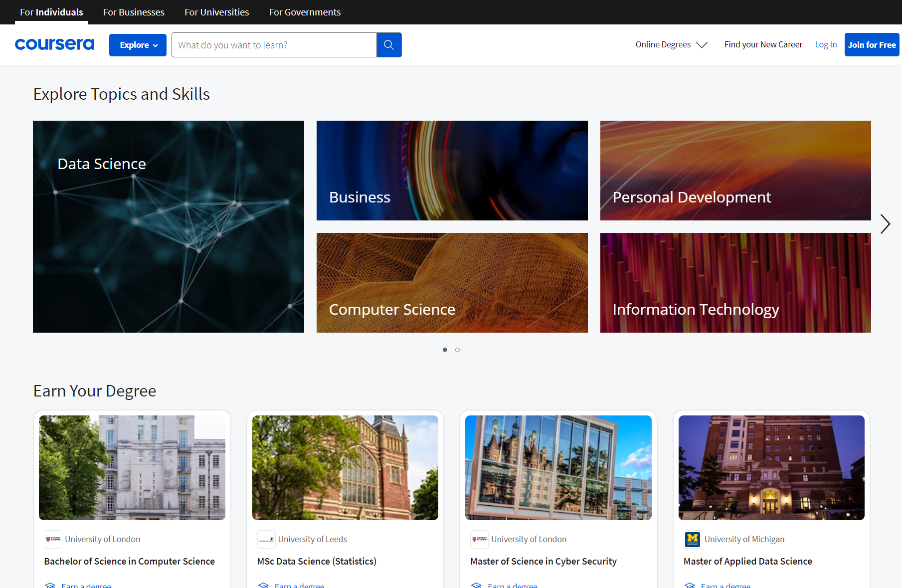 Το Coursera προσφέρει τόσο δωρεάν όσο και επί πληρωμή μαθήματα σε ένα ευρύ φάσμα θεμάτων, όπως η επιστήμη των υπολογιστών, η επιστήμη των δεδομένων, οι επιχειρήσεις, η υγεία και άλλα. Όλα τα μαθήματα παραδίδονται διαδικτυακά από διαπιστευμένες ακαδημίες και διαδικτυακές πλατφόρμες μάθησης.