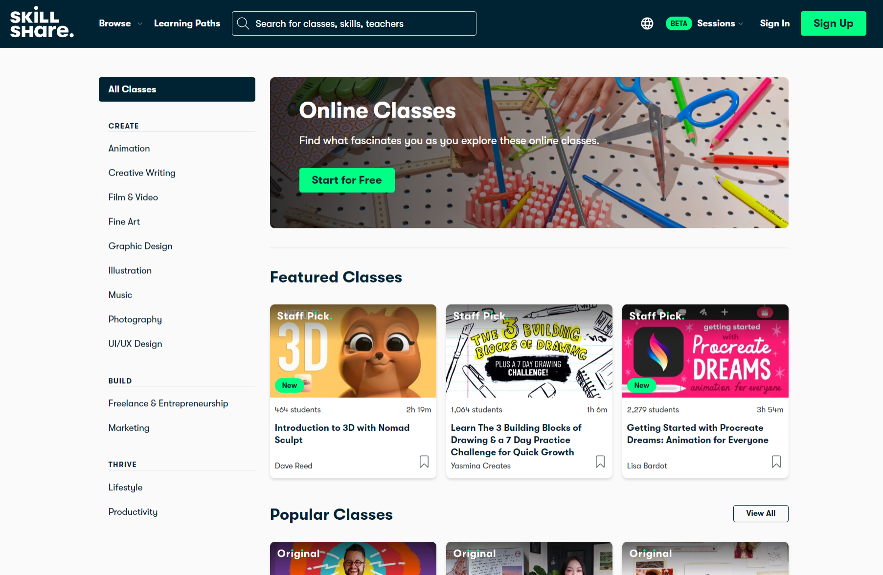 Γνωστό για τα δημιουργικά και πρακτικά του μαθήματα σε θέματα όπως το σχέδιο, η φωτογραφία, η γραφή και η επιχειρηματικότητα, το SkillShare είναι περισσότερο προσανατολισμένο στην κοινότητα, με πολλές μικρότερες τάξεις που βασίζονται σε συγκεκριμένα projects.