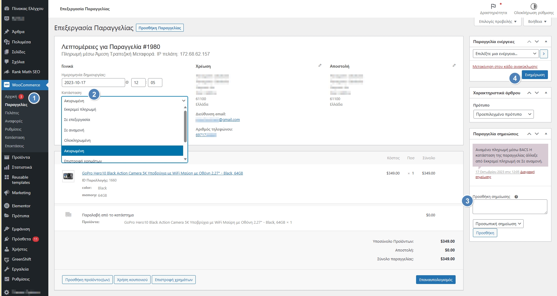 - Στην ενότητα ‘Κατάσταση’ άλλαξε την παραγγελία σε ‘Ακυρωμένη’ και κάνε κλικ στο ‘Ενημέρωση’ ώστε να πραγματοποιηθεί η αλλαγή.