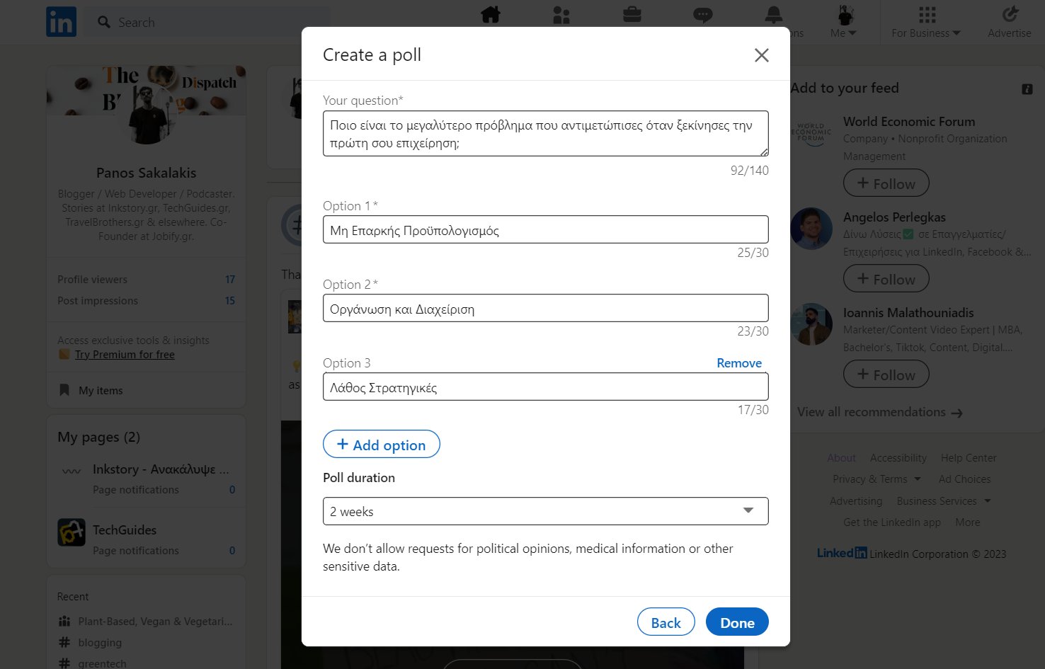 Επιπλέον, μπορείς να ανεβάζεις σχετικές αναρτήσεις από διάφορες ιστοσελίδες που αφορούν την δουλειά και τον κλάδο σου, να προωθείς τα δικά σου άρθρα και τη δική σου δουλειά, να δημιουργείς ψηφοφορίες με ερωτήσεις και πολλά ακόμα για να διατηρείς μια ροή στις αναρτήσεις σου.