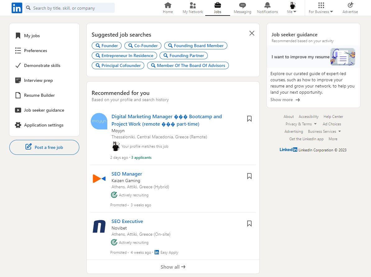 Το LinkedIn διαθέτει έναν πίνακα εργασιών στον οποίο μπορείς να αναζητάς για διαθέσιμες θέσεις εργασίας με λέξεις-κλειδιά, βάση τοποθεσίας, κλάδου, λειτουργίας και επίπεδο εμπειρίας. Μπορείς επίσης να λαμβάνεις ειδοποιήσεις για θέσεις εργασίας πάνω στον κλάδο σου ή που ταιριάζουν με τα κριτήρια σου, ενώ όταν βρεις μια θέση που σε ενδιαφέρει, το μόνο που έχεις να κάνεις είναι να διαβάσεις την περιγραφή της.
