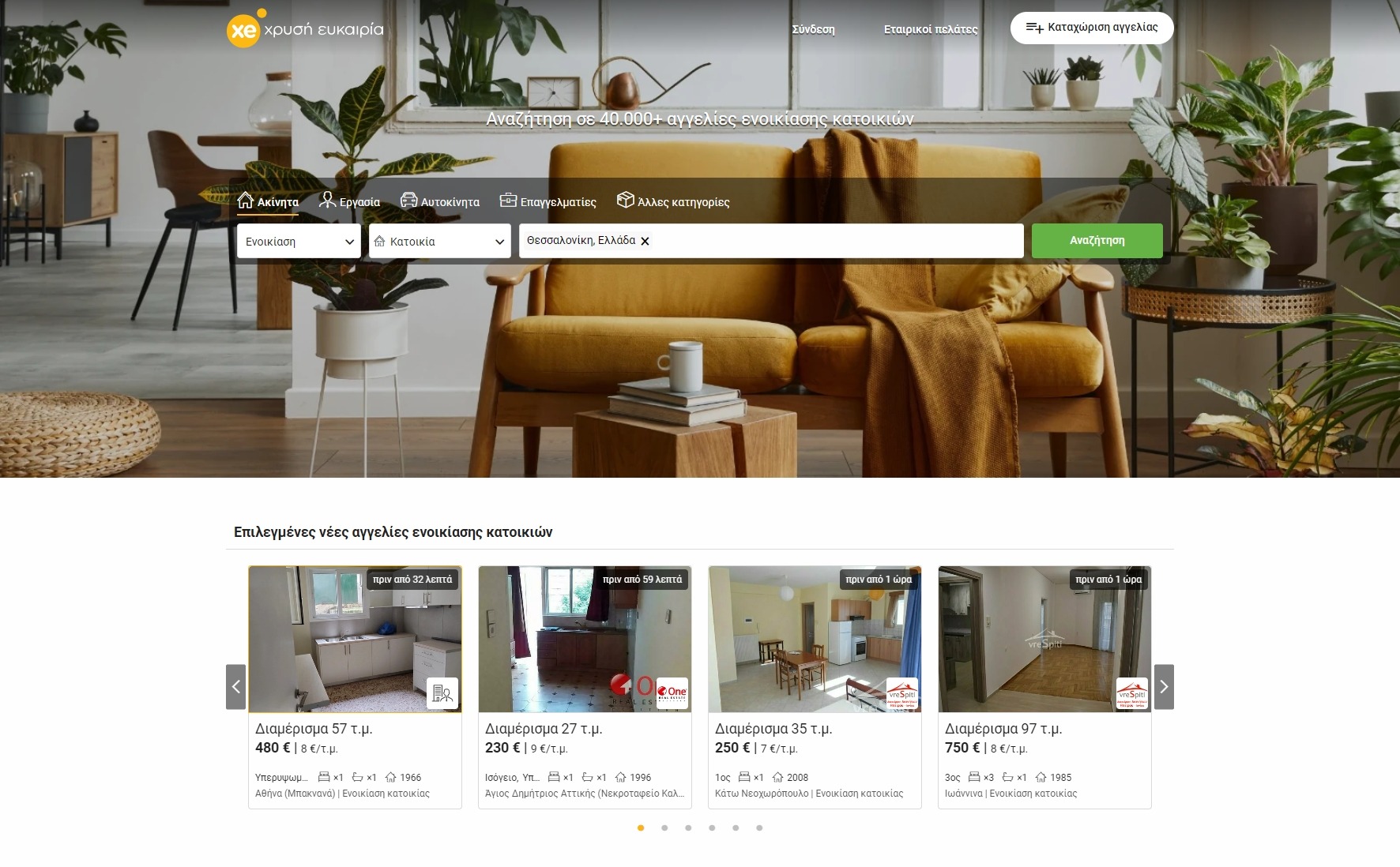 Η Χρυσή Ευκαιρία, της οποίας την ιστοσελίδα μπορείς να επισκεφτείς στο Xe.gr, πρόκειται για μια απ’ τις μεγαλύτερες και γνωστότερες στην Ελλάδα, παρέχοντας περισσότερες από 40 χιλιάδες αγγελίες για ενοικιάσεις κατοικιών. Παρόλα αυτά, για να καταφέρεις να χρησιμοποιήσεις τα φίλτρα της ιστοσελίδας, θα πρέπει πρώτα να αποκτήσεις το premium συνδρομητικό τους πακέτο.