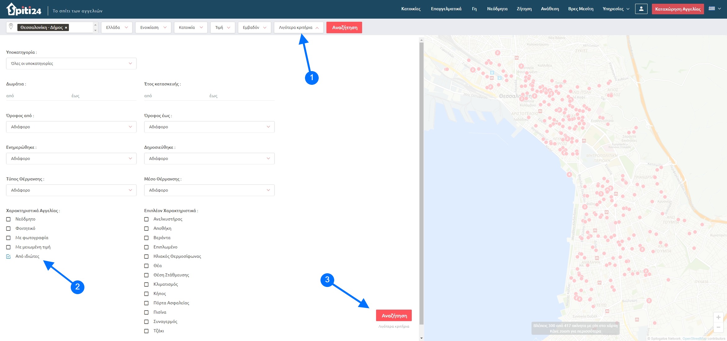 Το μόνο που έχεις να κάνεις είναι να επιλέξεις αρχικά σε ποια περιοχή θέλεις να αναζητήσεις για ενοικιαζόμενα σπίτια, και στη συνέχεια να κάνεις κλικ στην επιλογή “Περισσότερα κριτήρια” και να επιλέξεις την επιλογή “Από ιδιώτες“.