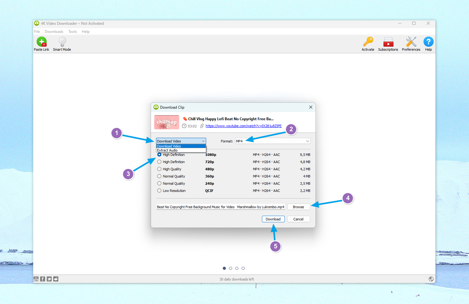 5. Από το αναδυόμενο παράθυρο που θα εμφανιστεί, επέλεξε αν θέλεις να κατεβάσεις το βίντεο σε μορφή βίντεο ή τραγουδιού, συμπεριλαμβανομένων σε MP3, MP4, MKV, M4A και OGG.