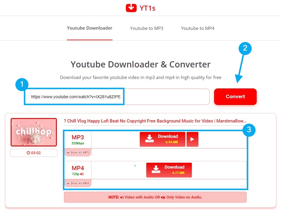 Για να κατεβάσεις ένα τραγούδι ή ένα βίντεο, απλά αντέγραψε το URL σύνδεσμο του και στη συνέχεια επικόλλησε τον μέσα στο διαθέσιμο πεδίο που παρέχει η εκατοστέ σελίδα. Στο παρακάτω παράδειγμα με το YT1s.de, απλά κάνεις επικόλληση τον σύνδεσμο, κάνεις κλικ στο κουμπί “Convert” και στη συνέχεια επιλέγεις σε ποια μορφή θέλεις να κατεβάσεις το βίντεο (MP3 ή MP4).