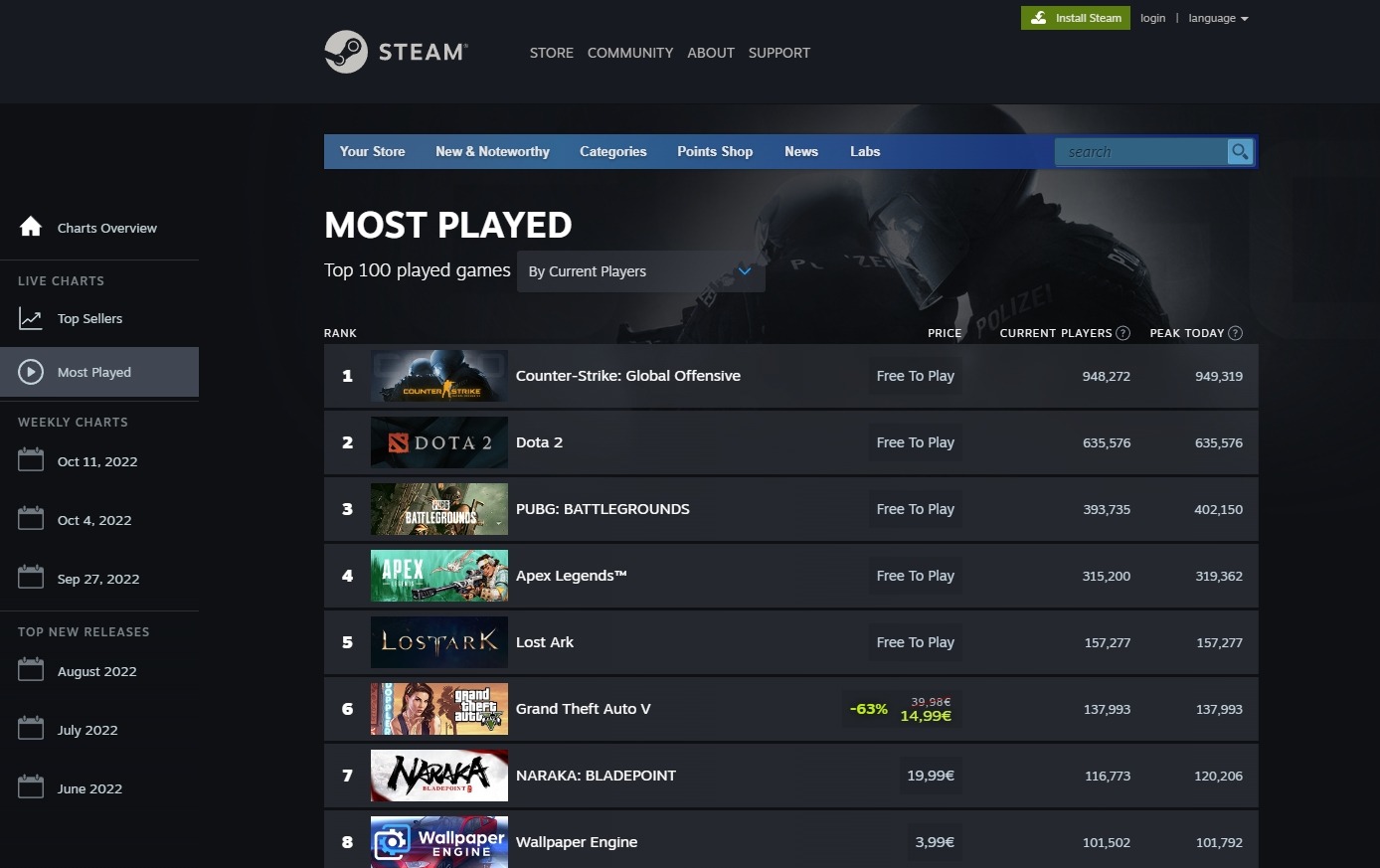 Ο κατάλογος με τα παιχνίδια που έχουν παιχτεί περισσότερο στο Steam.