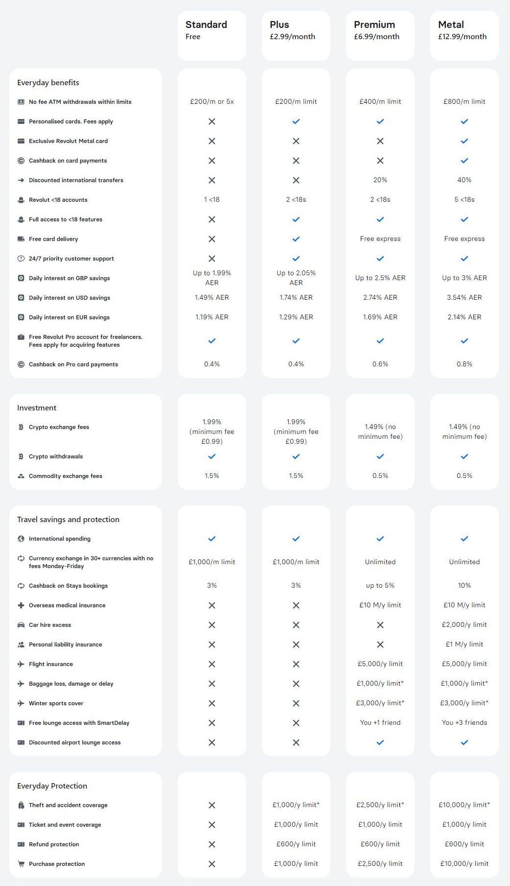 Το Revolut Standard παρέχεται δωρεάν, το Revolut Plus κοστίζει 2.99$ μηνιαίως, το Revolut Premium κοστίζει 6.99$ μηνιαίως και το Revolut Metal κοστίζει 12.99$ μηνιαίως. Μπορείς να δεις τις διαφορές των πακέτων από την παραπάνω φωτογραφία, ενώ δεν θα χρειαστείς ένα συνδρομητικό λογαριασμό εκτός κι αν θέλεις να μειωθούν τα όρια, να έχεις περισσότερες δυνατότητες μέσα από την εφαρμογή, καλύτερη ασφάλιση και μια μεταλλική αντί για πλαστική κάρτα.